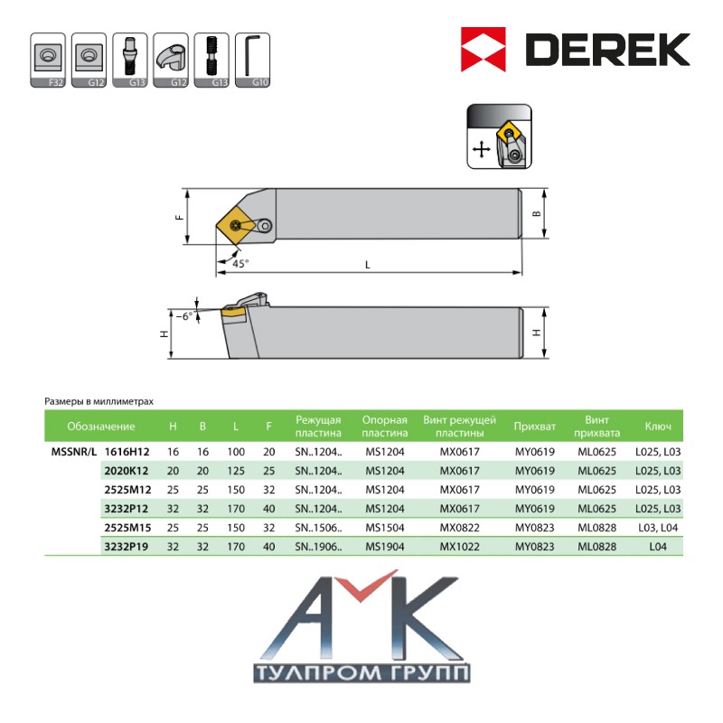 Резец (державка токарная) для наружного точения артикул MSSNL 3232P19, левый, для сменных пластин, от производителя DEREK