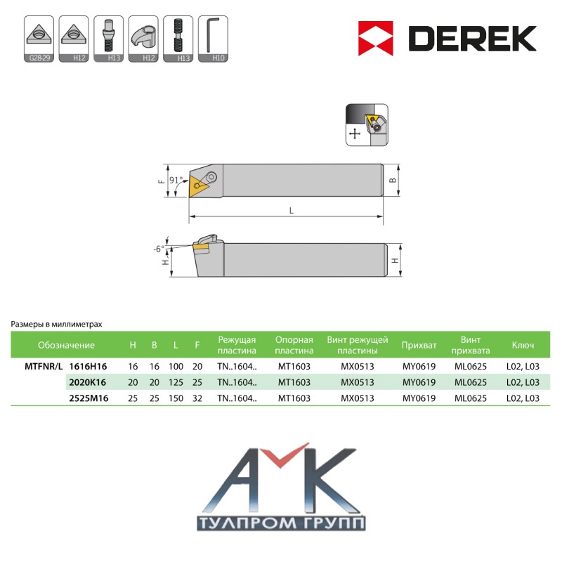 Резец (державка токарная) для наружного точения артикул MTFNR 2020K16, правый, для сменных пластин, от производителя DEREK