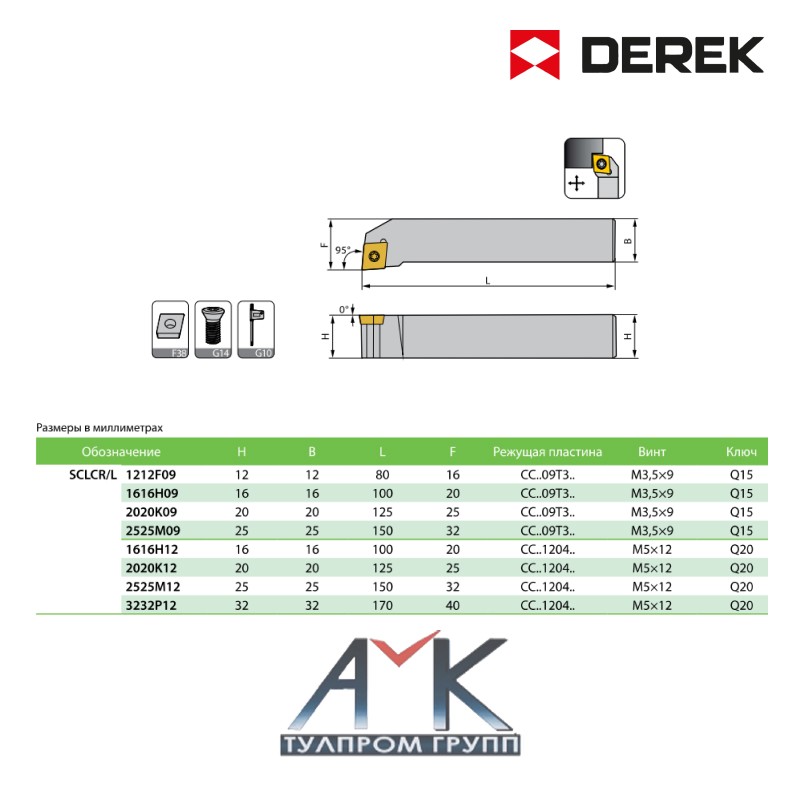 Резец (державка токарная) для наружного точения артикул SCLCR 1212F09, правый, для сменных пластин, от производителя DEREK