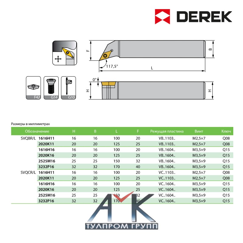 Резец (державка токарная) для наружного точения артикул SVQCR 1616H16, правый, для сменных пластин, от производителя DEREK