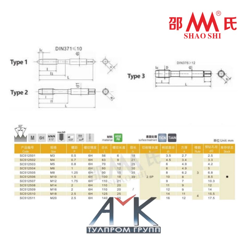Машинный метчик M4 со спиральной канавкой R15° арт. SC512502 от производителя SHAO SHI.
