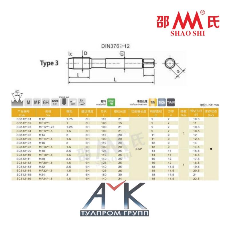 Машинный метчик MF14 х 1,5 с винтовой канавкой R45° арт. SC512106, с укороченным хвостовиком, шаг 1,5 мм, DIN 376/374, 6H, HSSE PM, угол 60°, от SHAO SHI