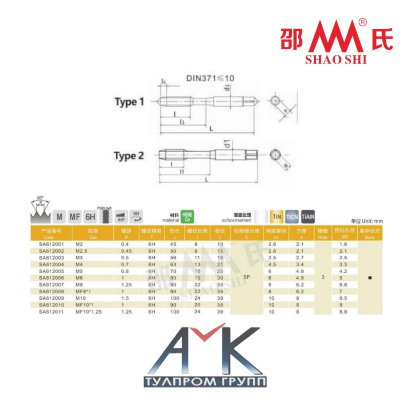 Машинный метчик спиральный M2,5 с усиленным хвостовиком арт. SA612002, шаг 0,45 мм, DIN 371, 6H, HSSE Co, угол 60, от SHAO SHI