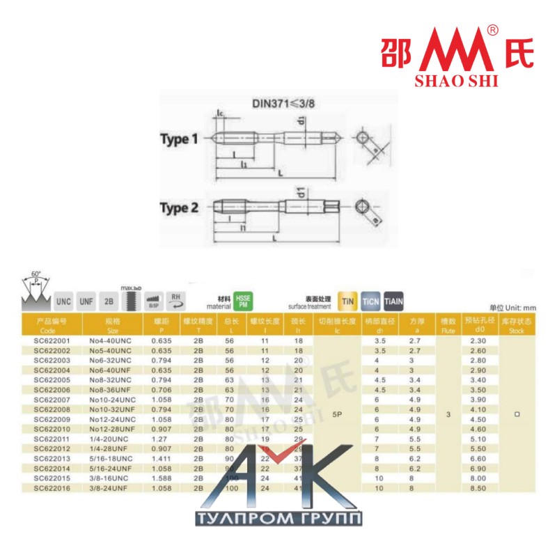 Метчик машинный спиральный No4-40UNC арт.SC622001, с усиленным хвостовиком, шаг 0,635 мм, по DIN 371, угол 60°, HSSE-PM, от SHAO SHI
