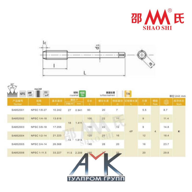 Прямоканавочный метчик NPSC 1-11.5 арт. SA852006, шаг 2.209 мм, с прямой трубной резьбой, DIN 5156, HSSE Co, угол 60°, от SHAO SHI