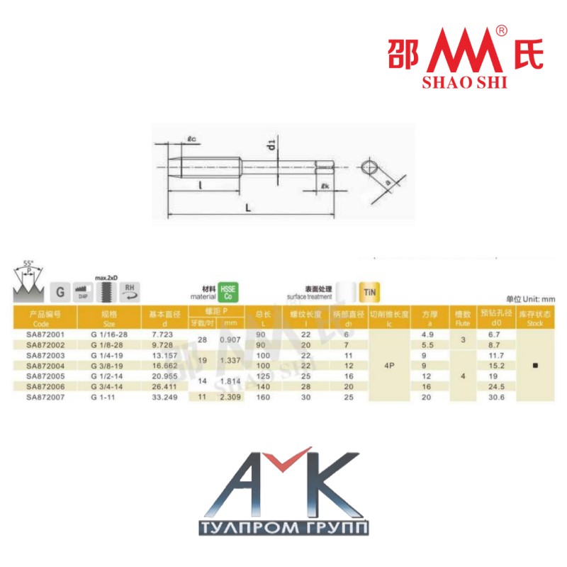 Прямоканавочный метчик с прямой трубной резьбой G 1/16-28 арт.SA872001, шаг 0,907 мм, по DIN 5156, HSSE-Co, угол 55°, от SHAO SHI