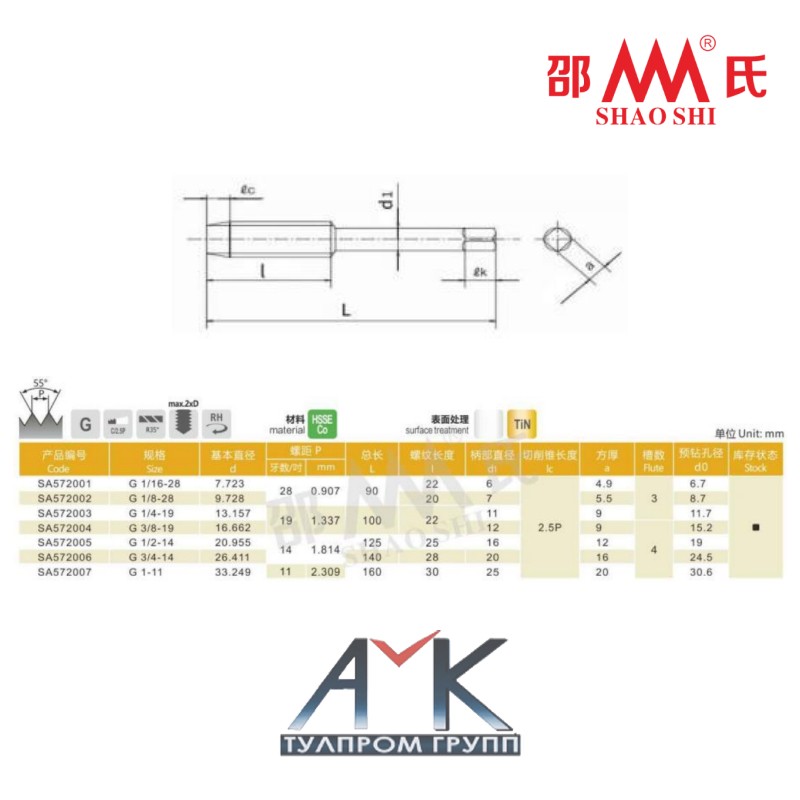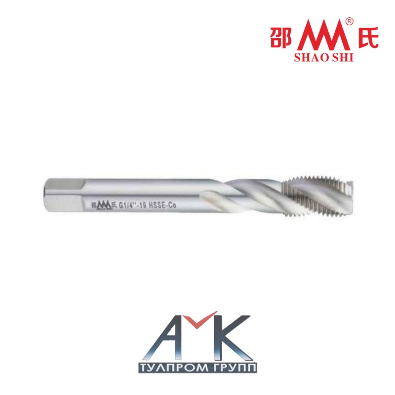 Спиральный конавочный метчик G 3/8-19 арт. SA572004, шаг 1,337 мм, с прямой трубной резьбой, DIN 5156, HSSE Co, угол 55°, от SHAO SHI