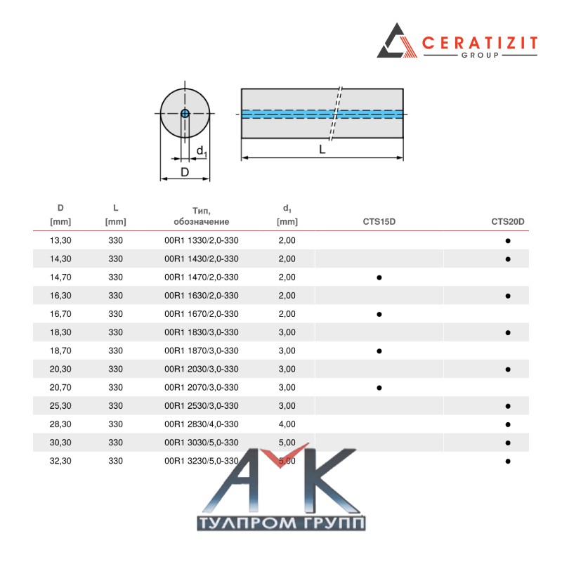 Пруток твердосплавный VHM 13, 30 х 330 мм арт. 00R1 1330/2,0-330, с центральным каналом охлаждения, сплав CTS20D, круглый, от CERATIZIT