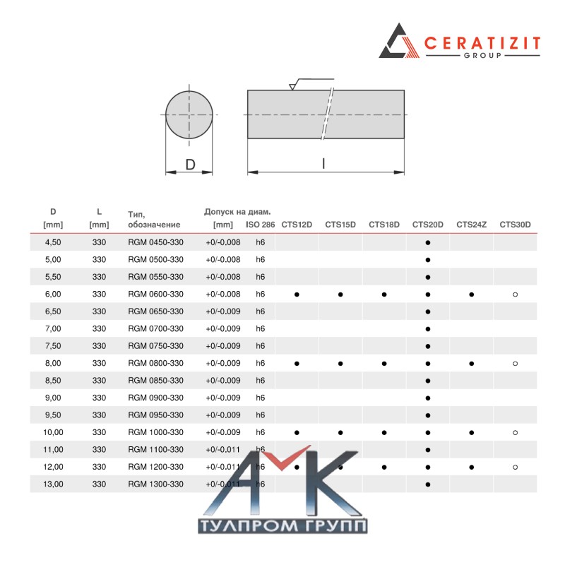 Пруток твердосплавный VHM 4,5 х 330 мм арт. RGM 0450-330, сплав CTS20D, круглый, ISO 286 h6, от CERATIZIT