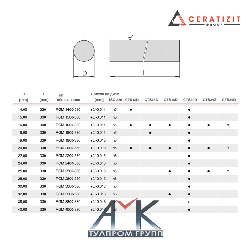 Пруток твердосплавный VHM 4, 5 х 330 мм арт. RGM 0450-330, сплав CTS20D, от производителя CERATIZIT.