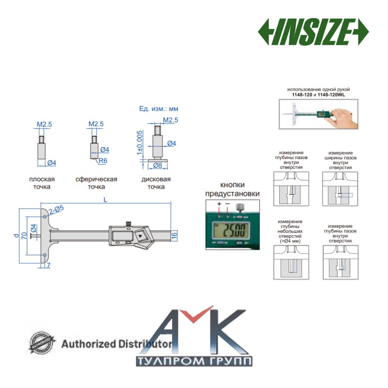 - Применение:При измерениях глубин малых отверстий (>Ø4 mm), ширины и глубины пазов внутри отверстий