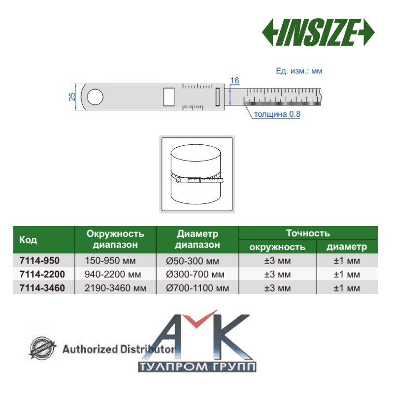 Циркометр / измерительная лента арт.7114-950, диап. диаметров 50-300 мм, диап. окружностей 150-950 мм, дискретность 0,1 мм, из нерж. стали, с лазерной гравировкой, от INSIZE