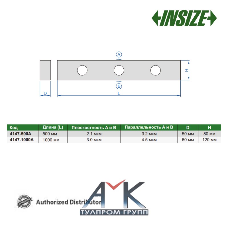 Гранитная поверочная линейка арт.4147-500A, общ. длина 500 мм, с широкой рабочей поверхностью прямоугольного сечения, от INSIZE