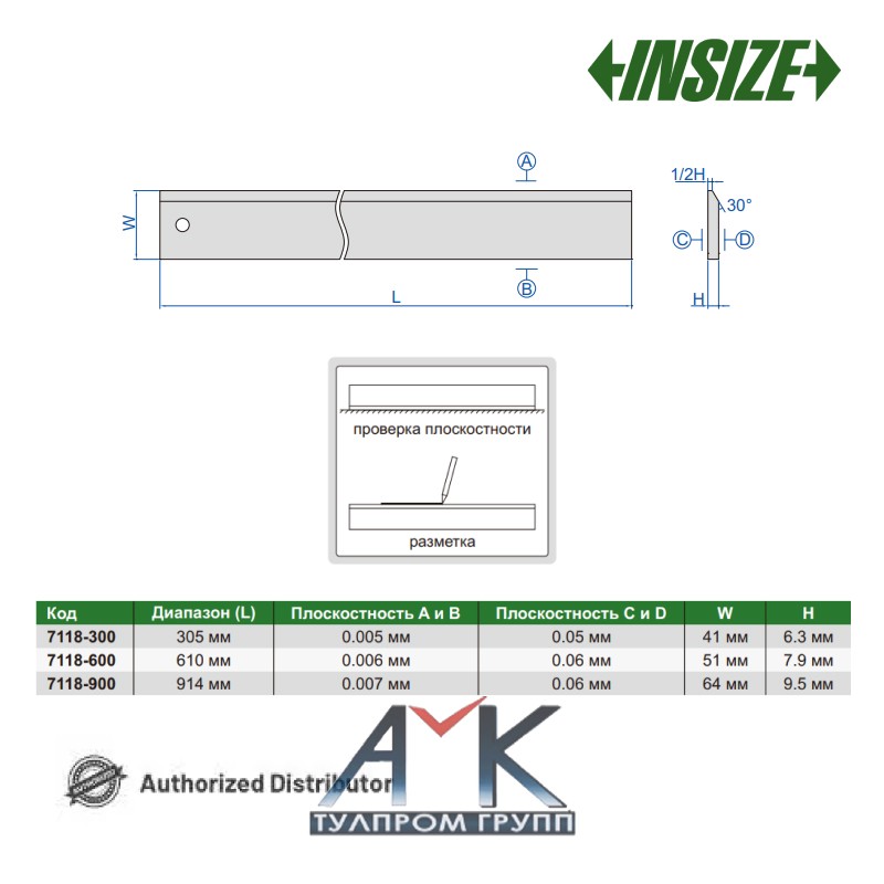 Поверочная линейка высокой точности со скошенным краем арт.7118-300, для проверки плоскостности и разметки, из инструментальной стали, от INSIZE
