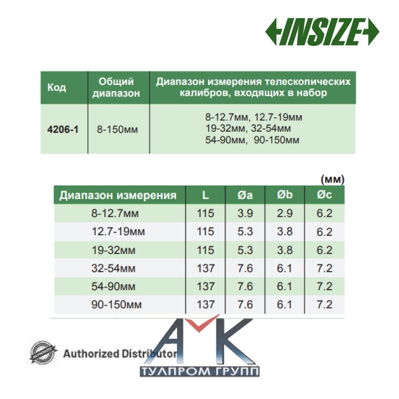 - Диап. измерений телескоп. калибров:8-12,7 mm, 12,7-19 mm,19-32 mm, 32-54 mm, 54-90 mm, 90-150 mm