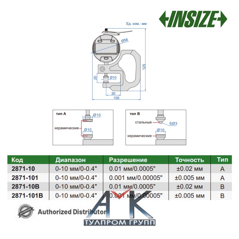 - Цифровой толщиномер арт. 2871-10, диап. измерения 0-10 мм / 0-0,4", дискретность 0,01 мм / 0,0005", с выводом данных, от INSIZE