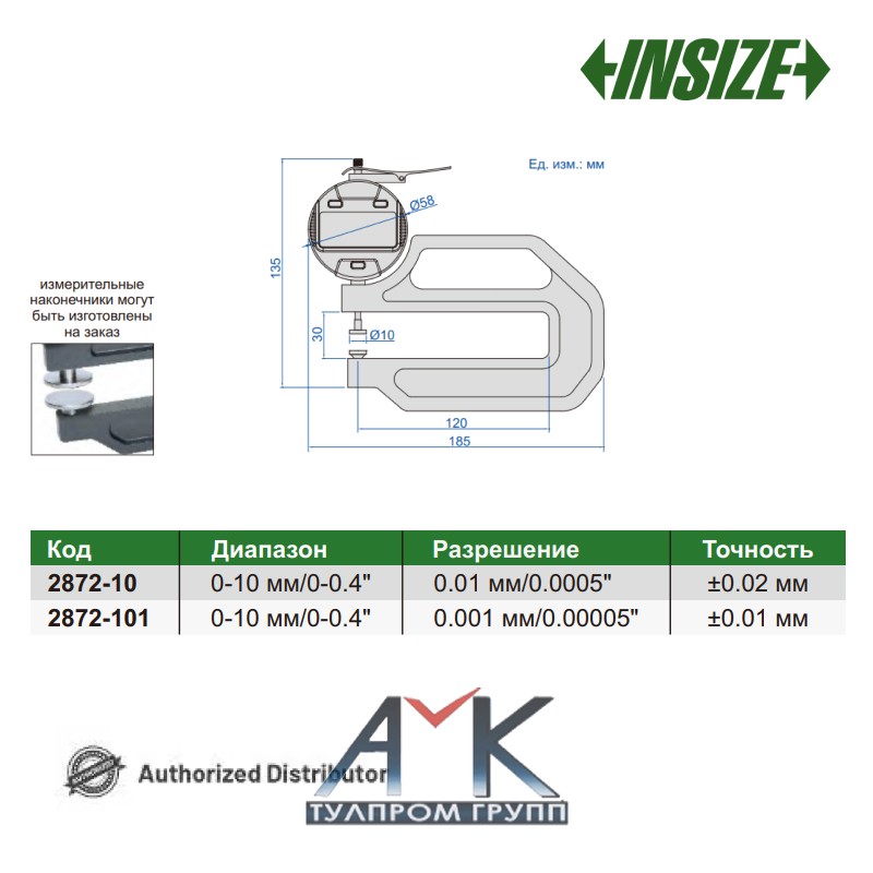 - Цифровой толщиномер арт. 2872-10, диап. измерения 0-10 мм, дискретность 0,01 мм, с выводом данных, от INSIZE