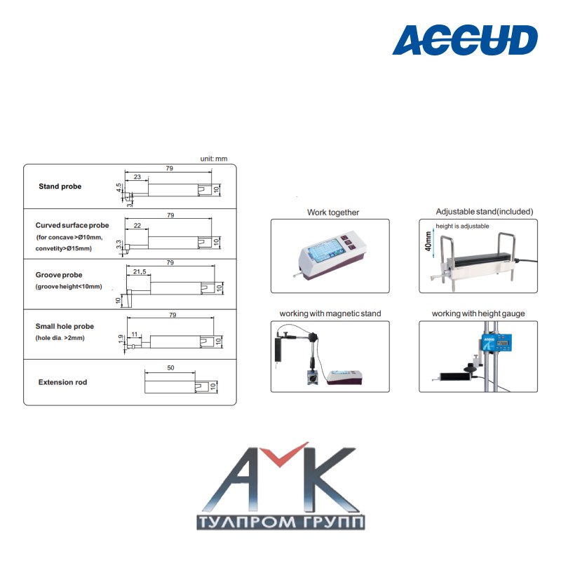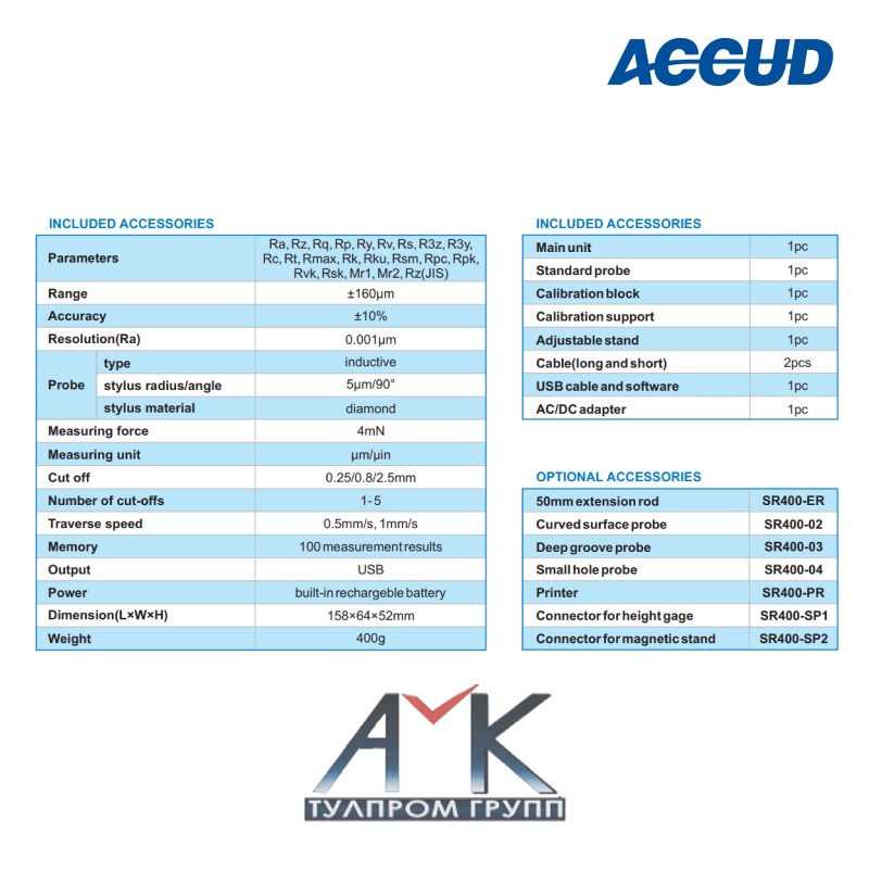 Доп. аксессуары: удлинительный стержень 50 mm (SR400-ER), изогнутый поверхностный зонд (SR400-02), зонд для глубоких канавок (SR400-03), зонд для исследования малых отверстий (SR400-04), разъем для высотомера (SR400-SP1), разъем для магнитной подставки (SR400-SP2).