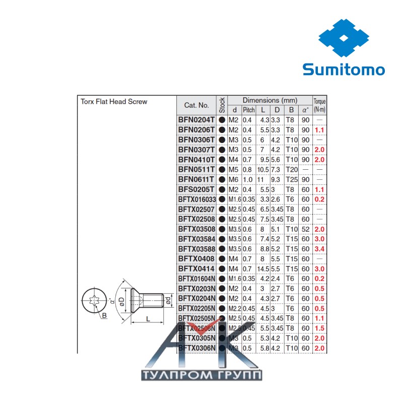 Винт с плоской головкой Torx М4 арт.BFTX0408 от Sumitomo.