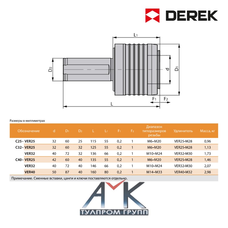Патрон C-VER для синхронизированного резьбонарезания арт.C25-VER25, общ. длина 115 мм, от производителя DEREK